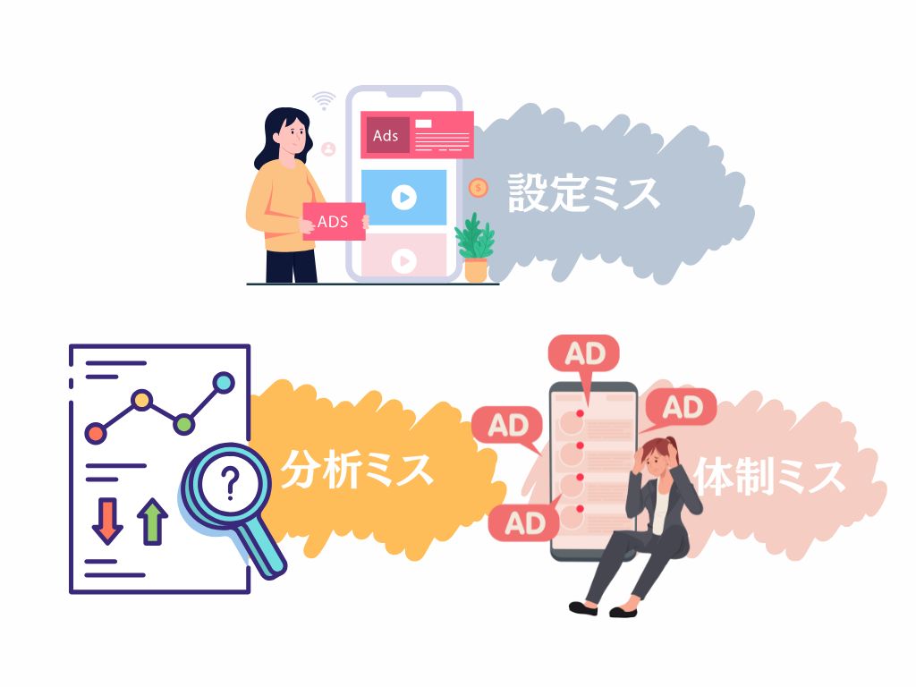 広告運用で発生するミスは、大きく分けて「設定」「分析」「運用体制」の3領域に分類できます。